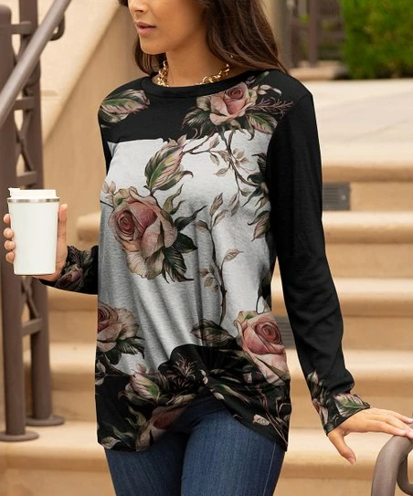 A stylish twist-front design, a bold print and a hint of stretch make this tunic a great addition to any outfit.
