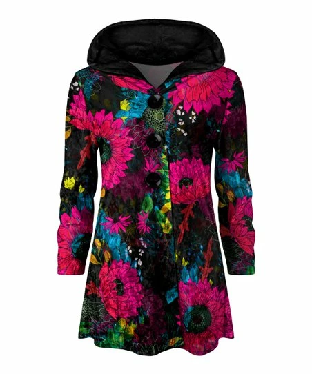 Lily | Black & Pink Floral Velvet Button-Front Hoodie – Women