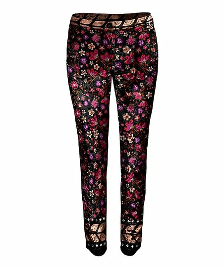 Soft velvet lends luxe appeal to these stretch-enhanced pants defined by a romantic pattern.