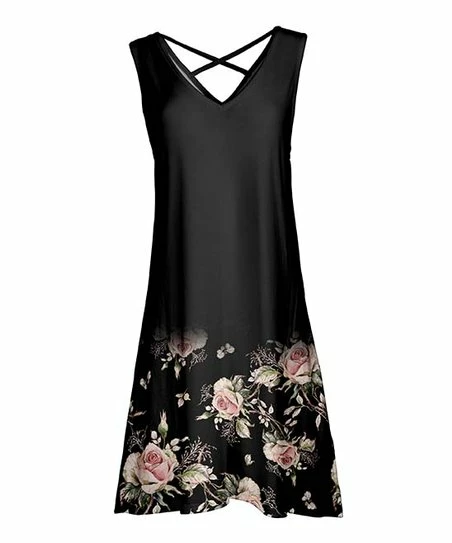 An edgy crisscross-back design makes for dramatic exits when you don this sunny-style dress fashioned with a romantic floral print and a generous neckline for your favorite trinket.