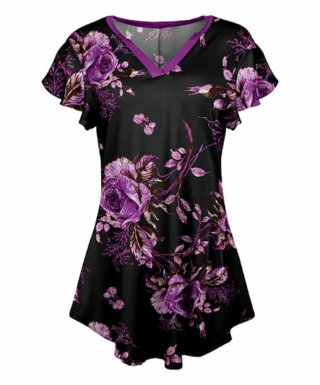 Restock your wardrobe rotation with this v-neck tunic featuring flutter sleeves and a curvy draped hem.