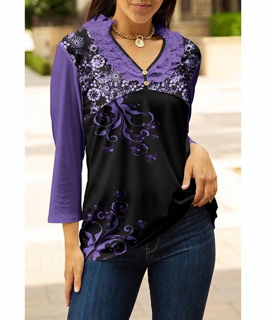 Finish off your fashionable ‘fit with this three-quarter sleeve tunic featuring dainty buttons and feminine ruffle details. Stretchy knit fabric ensures lasting comfort.