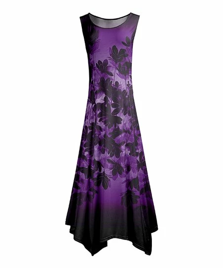 This stretch-enhanced sleeveless dress boasts a lush floral print and a flowing handkerchief hem for a sunny style with springtime flair.