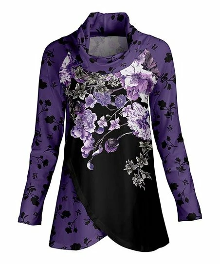 Feminine style blossoms to life in the design of this artsy tunic that flaunts a draped cowl neck and shapely tulip hemline. Long-sleeves help you stay cozy when temperatures drop.