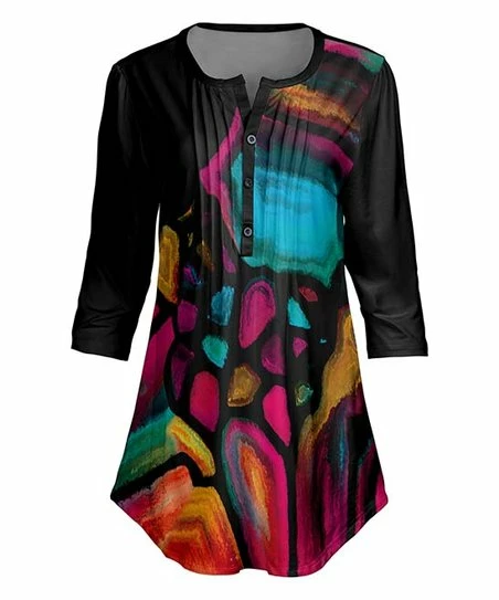 With a pleated button-front neckline and three-quarter sleeves, this tunic will become a front-runner in your wardrobe rotation.