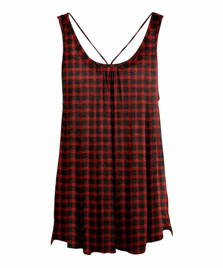 An ultra-flowy tunic designed with a sleeveless cut and pleating detail on the neckline. Classic buffalo check print.