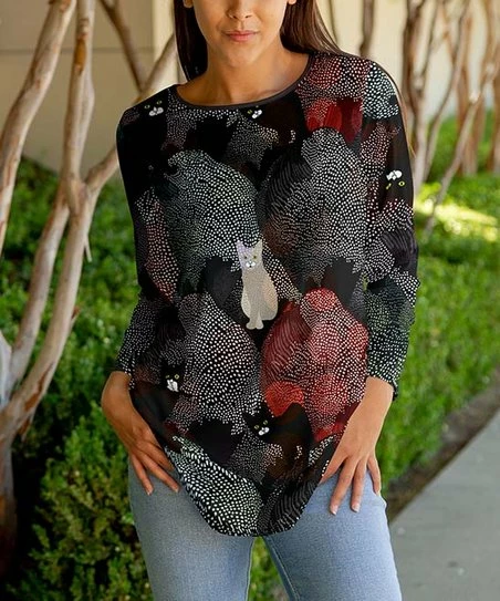 Three-quarter sleeves combine with a cool cat graphic to lend a pop of pizzazz to your casual look when you don this stretch-blend tunic.