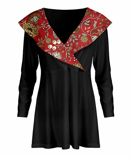 Designed with a contrasting cape collar, this stretch-infused tunic mixes solid color and print to create a stylish and fun top.