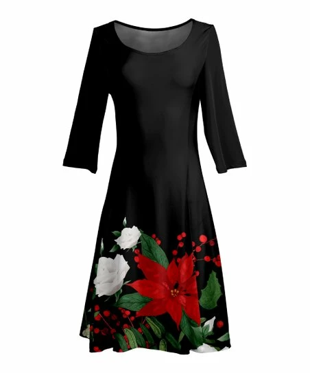 Lily | Black & Red Floral Long-Sleeve Boatneck A-Line Dress – Plus