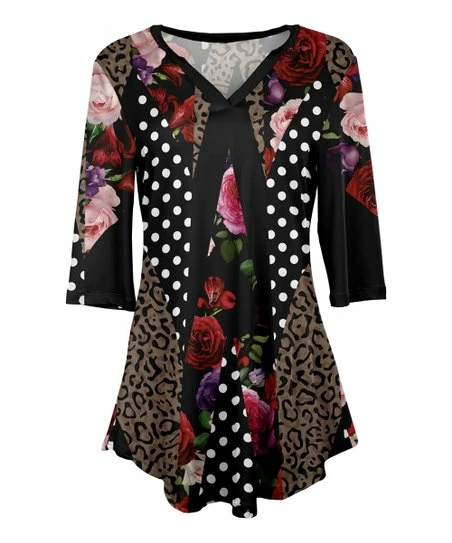 Update your wardrobe classics with this v-neck tunic featuring a bold print and a hint of stretch for added comfort.