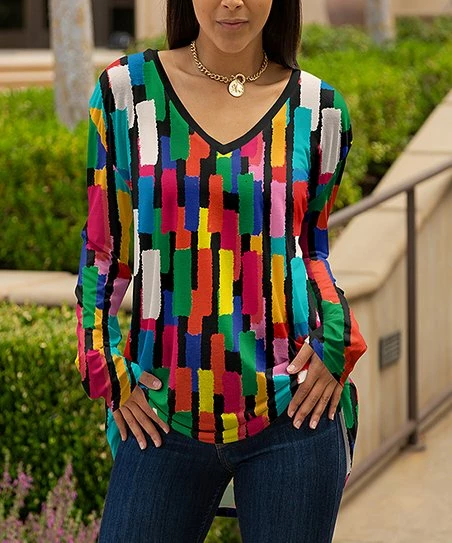 Accent any casual look with the color and style of this printed long-sleeve v-neck tunic.