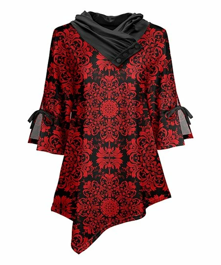 Tied sleeves and an angled asymmetrical hem bring mod spirit to this boldly patterned tunic that delivers cozy coverage with a button-capped neckline.