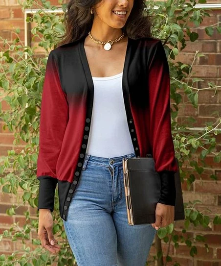 This snap-front cardigan offers a bold pattern and stretch-infused fabric.