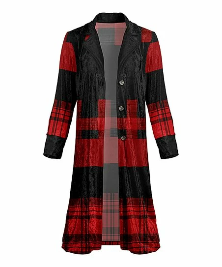 Add bold patterns to your wardrobe with the plaid design of this flowy, velvet duster fashioned with soft and stretchy fabric, shawl collar and button closure.