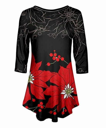 Ready your wardrobe for shifting temperatures with this festive tunic framed with three-quarter sleeves and a curved hem. A crewneck lets you finish off the look with your favorite necklaces.