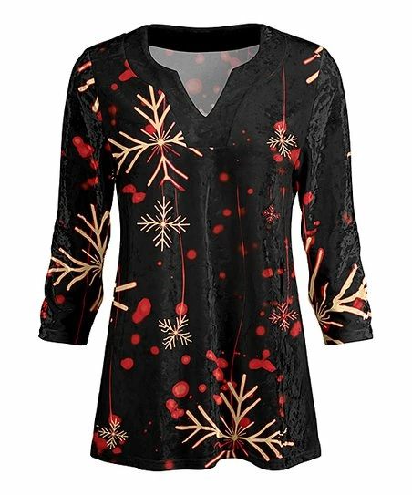 Merry days await when you pull on this long-sleeve tunic that features a festive print on sumptuous velvet fabric. A petite notch adds interest to the neckline.