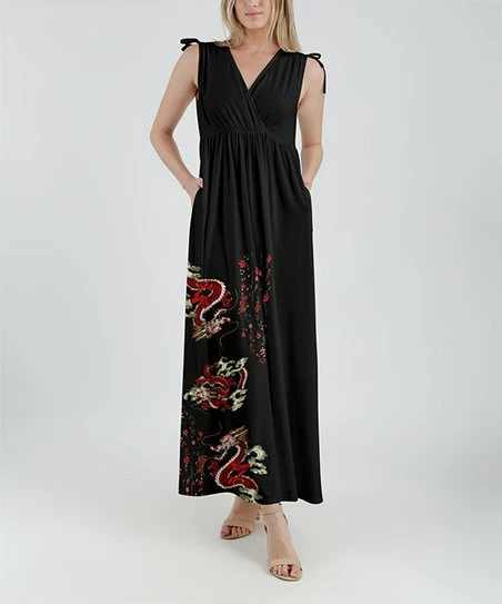 Drawstring straps add flair to this flowy maxi featuring a flattering neckline and outfitted with side pockets to casually rest hands.