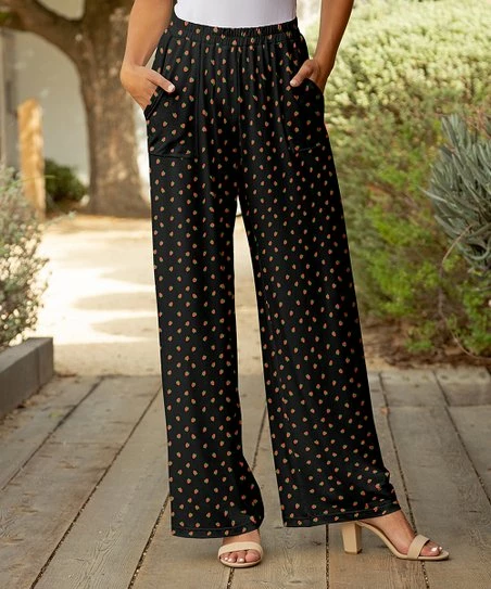 Patterned wide-leg pants with side pockets and stretch-enhanced fabric.