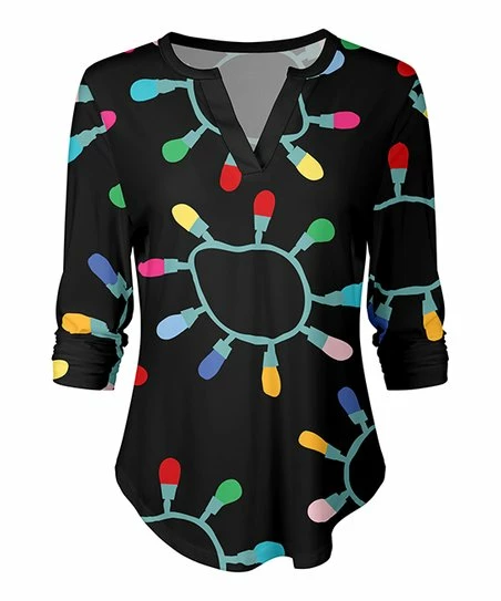 Feel very merry in the festive flair of this notch neck top featuring stretchy knit fabric and a flattering curved hemline for comfortably seasonal style that pairs effortlessly with jeans, leggings or slacks.