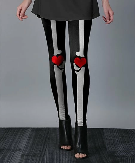 These lightweight and stretchy leggings feature faux knees patches with a spooky graphic.