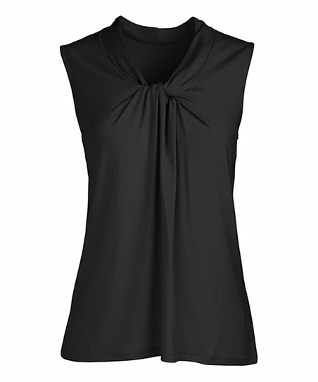 Look professional while staying cool in this lightweight sleeveless tunic that has a solid hue for styling versatility and a knotted neckline embellishment.