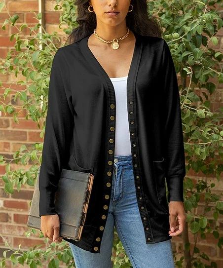 Update your layered looks with this solid-hued cardigan featuring stretchy knit fabric and an easy snap-button closure.