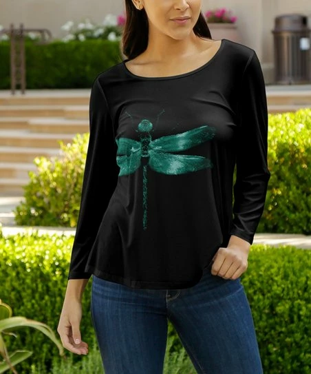 This top features a boatneck, a-line hem and stretchy fabric.