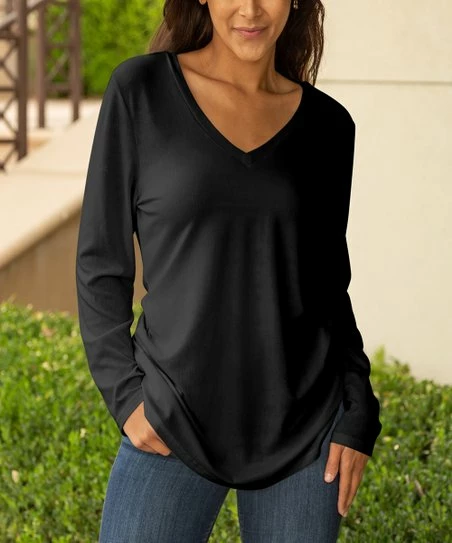 This v-neck tunic is designed with long sleeves and stretch-enhanced fabric.