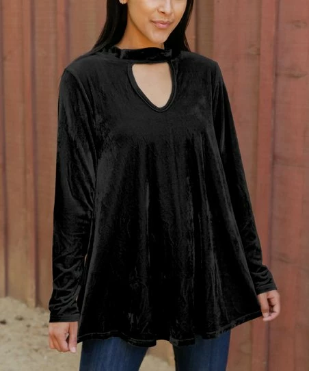 This velvet tunic is designed with long sleeves and a keyhole neckline.