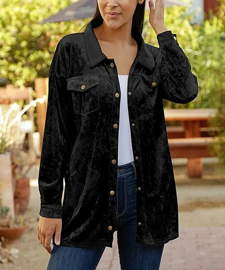 Layer in style with this button-up velvet top featuring front chest pockets.