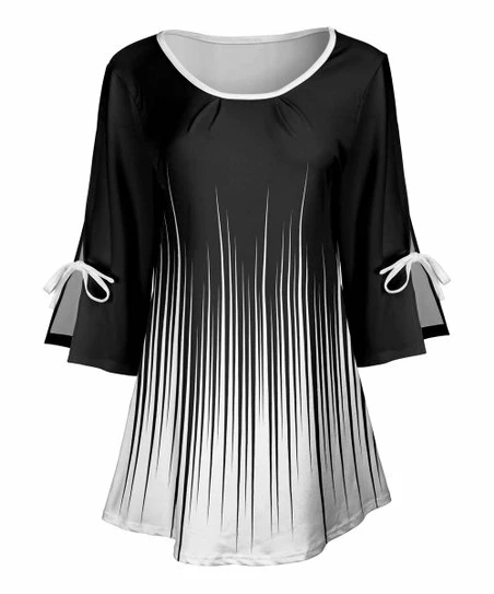 Bow accents finish the three-quarter length sleeves of this flowy tunic featuring stretch-enhanced material.