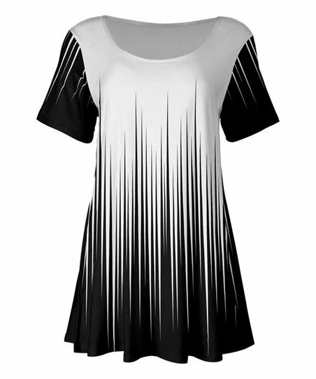 A flared cut makes this boldly patterned scoop neck oh-so flattering and the short sleeves set you up for warm-weather comfort.