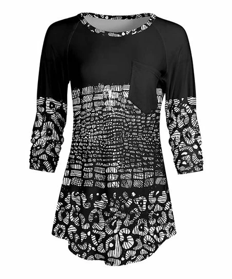 Venture out into transition weather with comfort when wearing this dramatically printed tunic framed by three-quarter raglan sleeves. A chest pocket gives you a place to carry along small odds and ends, and a dolphin hem brings everything to a curvy conclusion.