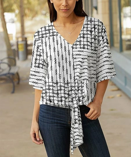 Head out in this relaxed top flaunting a head-turning pattern and sassy tie accent at the hem.
