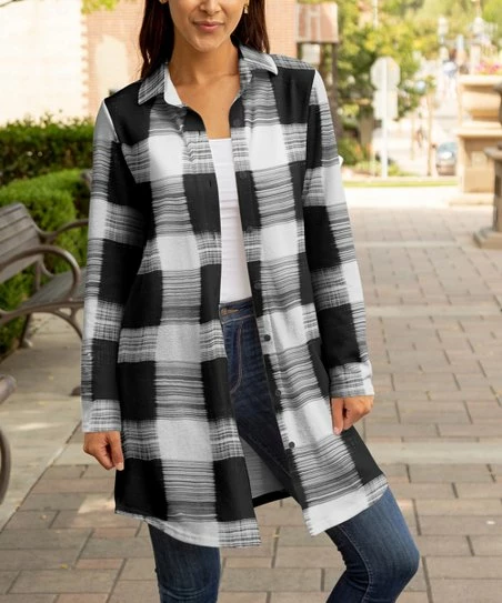 Lily | Black & White Buffalo Plaid Collared Button-Up Longline Shacket – Women & Plus