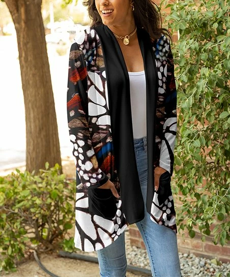 This open cardigan features solid-hue pockets and collar that contrast with the patterned design.