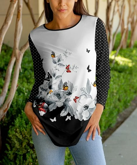 Lily | Black & White Butterfly & Polka Dot Three-Quarter Sleeve Tunic – Women