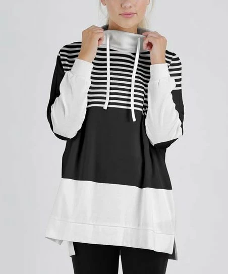 Printed longline pullover featuring funnel collar, drawstring and split hi-low hem.