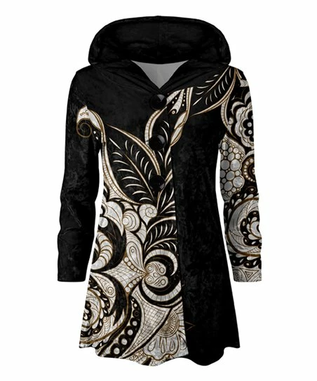 You’ll be cozy as can be in this patterned hoodie featuring a rich velvet fabric and button-up front.