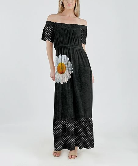 Elevate warm-weather days with the off-shoulder silhouette of this billowy maxi dress finished with a single bright bloom to give your look playful appeal.
