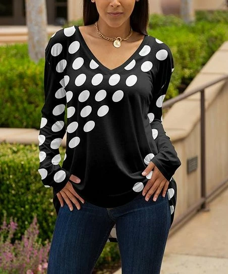 This relaxed-fit tunic features a crisp v-neck and cozy long sleeves. A bold pattern adds playful flair to your casual closet.