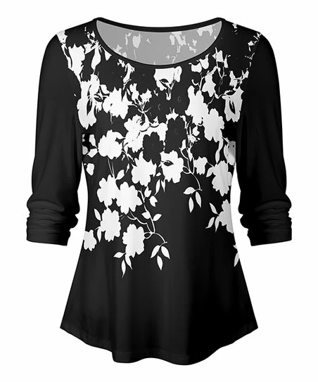 Stretch-infused material and a delightful all-over print make this flattering swing top an effortless addition to your everyday essentials.