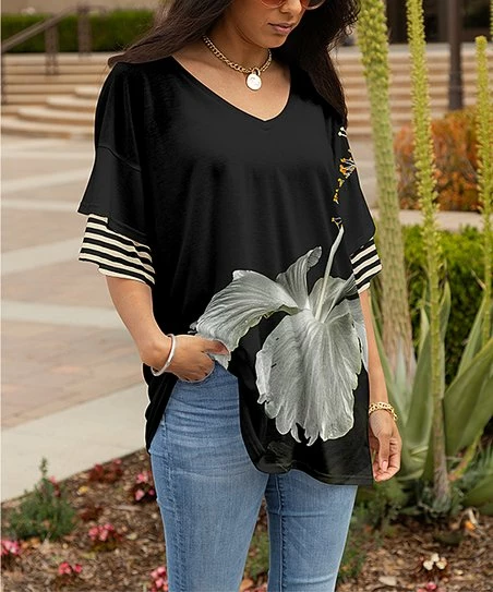 Layered ruffle sleeves and an allover print make this v-neck tunic a guaranteed head-turner during your weekend wanderings and beyond.