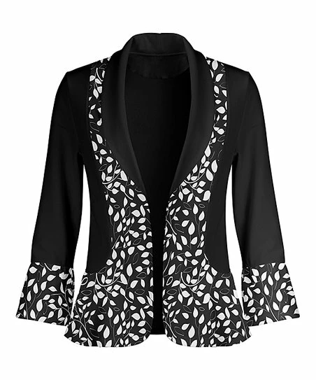 Stand out among that sea of cubicles wearing this blazer showcasing an artsy print and ruffly trumpet sleeves. A touch of stretch keeps you comfy from your morning commute through happy hour.