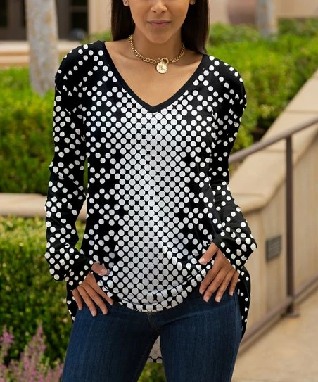 This versatile print tunic can be worn long or tucked in and features long sleeves and a classic v-neck.