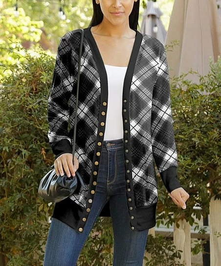 Stretch-blend cardi featuring a v-neckline and snap closure. Banded hem and cuffs.