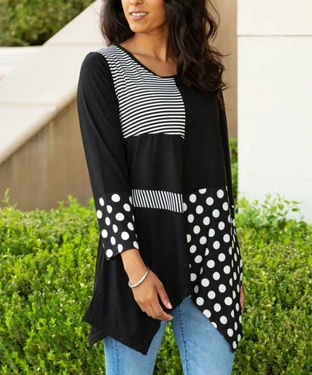 Flow through the day in this graceful tunic featuring a draping handkerchief hem and eye-catching pattern. A dose of stretch in the material ensures lasting comfort.
