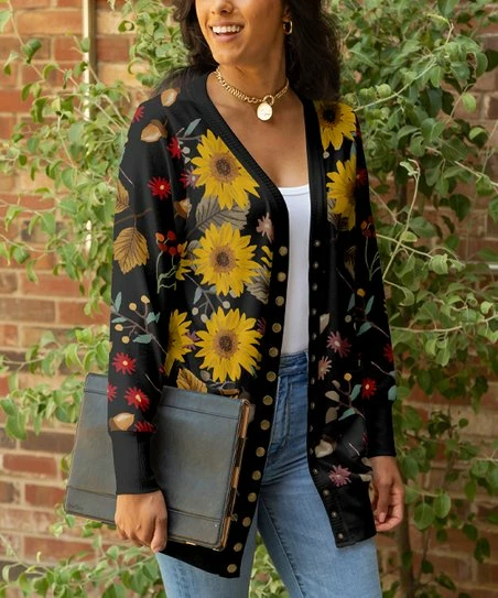 Opt for a cozy layered look on cooler days with this cardigan featuring a blooming pattern and convenient snap buttons along the front. Side pockets satisfy your need for storage space and offer a spot to warm your hands.