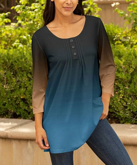 Ease through the day in this long-sleeve tunic featuring a buttoned neckline accented by pleated details.