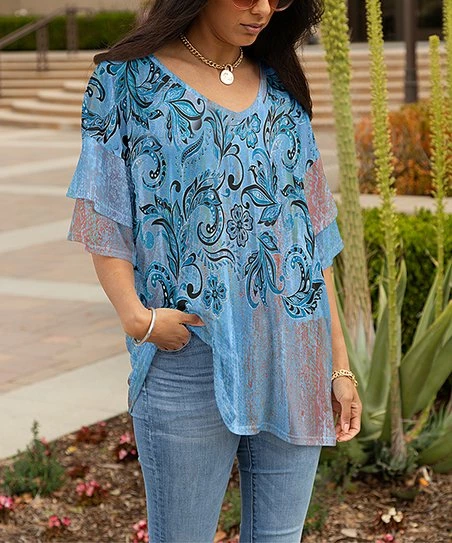 Flow through your day in this loose-fitting printed tunic featuring a wide v-neck and double-layered bell sleeves.